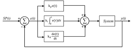 PID is the most widely used classical controller in engineering and industrial applications, designed to regulate the system’s behavior. Thus, it mainly consists of regulating an output measurement, y(t), to track a desired setpoint SP(t). To achieve this operation, the proportional (), integral (), and derivative () gains are tuned to minimize the error (e(t)) between the actual and desired setpoint as can be seen in Figure 3, guaranteeing system stability, and meeting other performance criteria. These criteria include settling time, overshoot, oscillation period, and robustness, among others. Consequently, the tuning process of the PID gains typically involves defining a trade-off problem among these criteria to optimize the controller’s performance.