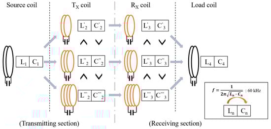 The self-resonant wireless power transfer system consists of four coils: a source coil, Tx coil, Rx coil, and load coil. The relay coil (Rx coil, Tx coil) consists of a simple structure in which one inductor and one capacitor are connected in series. For each coil, capacitors are connected in series to the inductance of the winding so that the frequency of the input power becomes the resonance frequency. The configuration of the self-resonant wireless power transfer system is shown in Figure 5a, and the configuration of the capacitor for the winding and resonance frequency of each coil is shown in Figure 5b. Because each coil becomes a resonance circuit for the input power, only the resistance component exists. In this study, since the frequency of the power input to the coil was 60 kHz, each coil was designed so that the resonance frequency was 60 kHz.