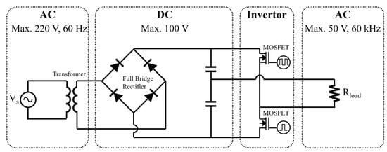 The frequency of the power used for wireless power transmission is different for each device, transmission method, and country. Depending on the transmission method, the magnetic induction method represents various frequencies, such as hundreds of kilohertz. The magnetic resonance method represents tens of kilohertz, and the microwave method represents a few kilohertz. Among various application fields, the wireless charging frequency of electric vehicles is 19–21 kHz, 55–65 kHz, and 79–90 kHz. Among them, the power is designed based on the frequency of 60 kHz most representatively used in the wireless charging of electric vehicles. The configuration diagram for the power design is as shown in Figure 3. To convert the inputted commercial power to a high frequency AC power of 60 kHz, the AC power of 60 Hz and up to 220 V is converted to DC through a full bridge rectifier. A transformer is used at the front end of the full bridge rectifier. The transformer is used to reduce the voltage at the output end of the transformer. It plays a key role in separating the circuit of the commercial power source and the circuit of the high-frequency generator. After charging the capacitor using the output of the full bridge rectifier, a high-frequency alternating current is generated through the half bridge inverter. For high-frequency power conversion, a metal–oxide–semiconductor field-effect transistor—a power switch with a high switching operation—is used. The gate driver input signal for the switching operation is controlled by emitting a signal using NE555 and inputting it to the gate driver. A high-frequency AC power system of 60 kHz is constructed through the design and manufacture of this high-frequency generator power source.