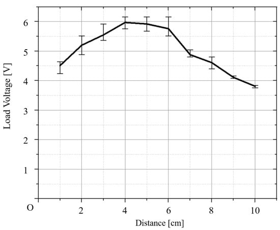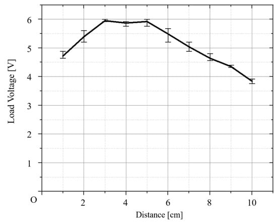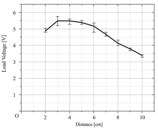 A graph for the average output voltage for Case II is shown in Figure 8. The maximum value of the average output voltage is 5.97 V, and the distance between the coils is 4 cm. The measured voltage and average voltage for each distance of Case II are provided in Table 2.