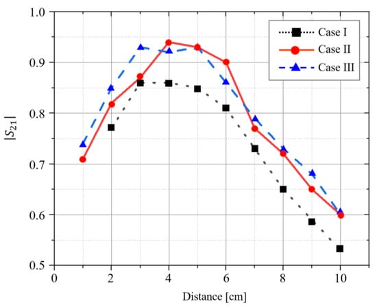 To show the efficiency of power transmission for each case, Equation (5) is used and compared with the S21 parameter. Its graph is shown in Figure 10. The efficiency of the maximum power transmission in the S21 parameter is shown at the 4 cm distance between the coils of Case II. The rate of increase in efficiency between each case does not show a constant increase for each distance; thus, it is difficult to simply compare them. Therefore, the rate of increase between the cases is compared at 3 cm and 4 cm in the distance between the coils, which represent the maximum average voltage for each case. In Case I, the increase rate of Case II shows an increase of approximately 1% at a distance of 3 cm and approximately 9% at 4 cm. In Case II, the increase rate for Case III is approximately 7% at 3 cm, and the decrease rate is approximately 2% at 4 cm. As shown in Figure 10, the power transmission efficiency increases when the inductance (turns) of the relay coil is increased. However, when comparing Case II and Case III, it is observed that no significant difference exists in transmission efficiency. Accordingly, the power transmission efficiency increases as the inductance of the relay coil increases. However, with the increase in inductance, as in the comparison of Case II and Case III, a saturated section occurs that no longer increases with the improvement in power transmission efficiency. When comparing the winding number, it is observed that the winding number ratio of the source coil, the load coil, and the relay coil increases the efficiency of power transmission at the winding ratio of 1:2 rather than that of 1:1.