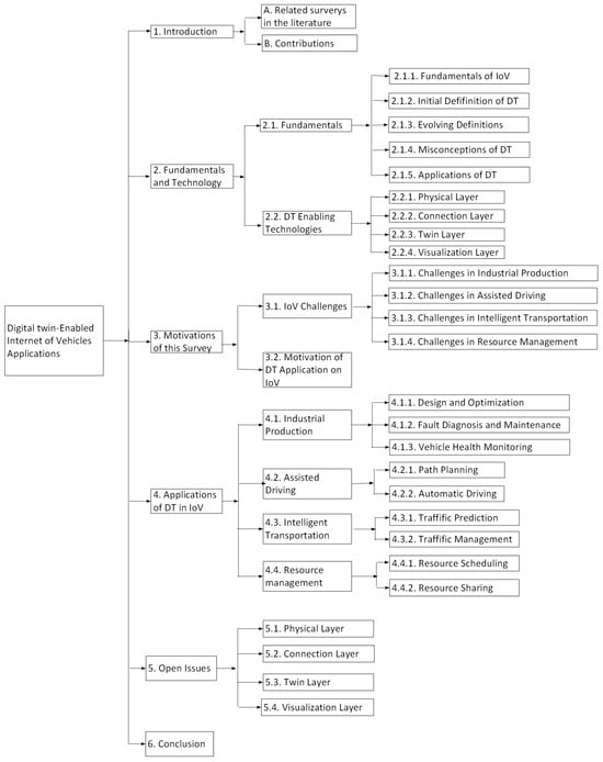 Given the burgeoning interest in the application of DT within the IoV, our review aims to fill the gap in the existing literature on this application. Despite a considerable number of publications from 2020 to 2023 that discuss the integration of DT in IoV, there is a dearth of structured reviews in this specific area []. Most existing reviews either focus on the broader applications of DT or barely scratch the surface of its potential roles within IoV. Hence, our paper aims to provide a comprehensive summary and classification of existing research while placing emphasis on the unique contributions and goals of integrating DT and IoV. This paper summarizes the research results from the past 3 to 5 years and summarizes these results in four main directions according to the application direction: industrial production, assisted driving, intelligent transportation, and resource management. The research contributions of this paper are as follows: