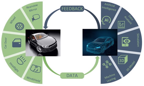 Figure 2 provides a schematic representation of a DT framework applied to vehicular systems. In the diagram, the physical world contains real vehicle information, including the rearview mirror, wheel, car door, headlight, and windshield. The virtual world can realize functions such as AI, data analysis, simulation, 3D modeling, and machine learning. The virtual world can accept changes in the physical world and make corresponding changes. At the same time, the physical world can also accept instructions from the virtual world and perform corresponding actions. DT involves continuously updating and interacting with physical entities and virtual models to achieve more accurate and reliable simulation, prediction, and control effects. Only a true DT can realize the two-way information transmission between the physical world and the virtual world, thus providing more robust support for real-time monitoring, optimal design, maintenance, and other fields.