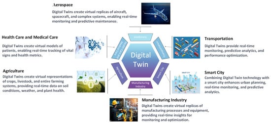 DT has garnered widespread adoption across a range of industries. In this section, this review provides a concise introduction to various applications of DT technology. A detailed list of these applications is shown in Figure 3.