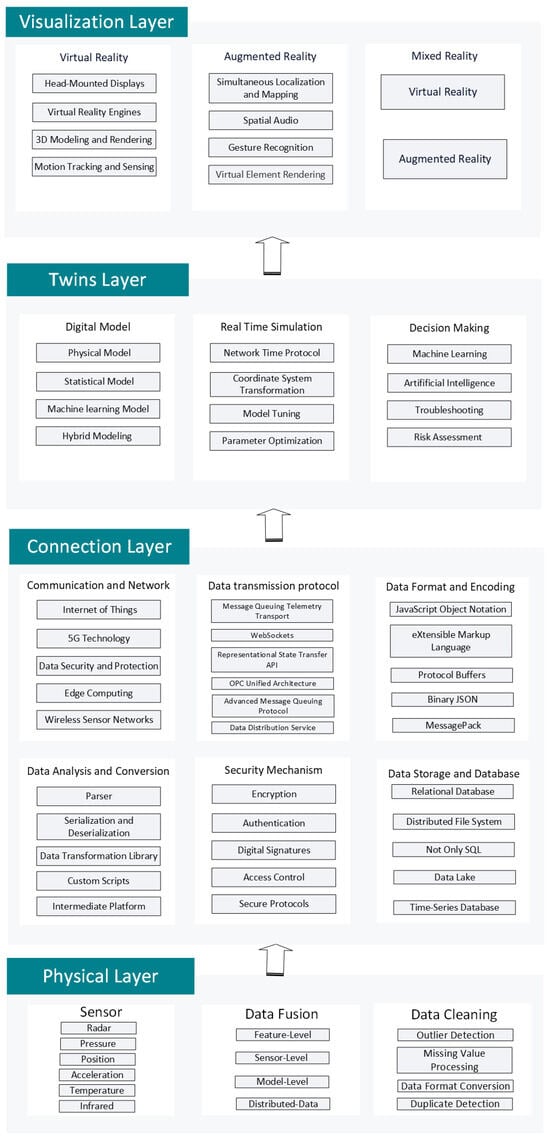 The physical layer refers to entities existing in the real world, which are responsible for sending their characteristics and other states to the twin layer so that the twin layer can be accurately simulated. The key technologies involved in this layer are as follows: