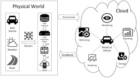 Firstly, real-time monitoring of the entire production process can be achieved by creating a DT to monitor the production cycle of vehicles []. The data generated in the vehicle production process will be transmitted to the digital model of the DT in real-time, which enables us to simulate and predict the vehicle performance and possible faults efficiently. Through effective health monitoring and early warning, vehicle problems can be solved promptly, thus reducing maintenance costs. Additionally, assuming that the vehicle maintenance unit and manufacturer are located in different places, the data in DT can be used to quickly check the status of the vehicle and save maintenance time []. At the same time, in the process of vehicle operation, the data is transmitted to the digital model in DT in real-time. By comparing with the model of a healthy vehicle, the time when the vehicle may fail can be predicted, thus improving driving safety []. In addition, DT’s digital model can also simulate the performance and fuel efficiency of vehicle parts. It can also detect and adjust the running status of vehicles in real-time to achieve the energy conservation goal. By constantly monitoring and optimizing the operation of vehicles, the fuel efficiency of vehicles can be maximized and energy consumption reduced.