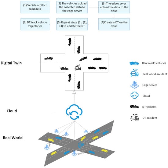 Finally, the application of DT in IoV can achieve a high degree of interaction with the physical world and simulate the operation of the entire transportation system by building a digital model []. By applying DT to the IoV, the driving conditions of all vehicles are acquired in real-time, and through interoperability with physical vehicles, the vehicles can upload information in real-time and receive real-time guidance from the twin to effectively avoid traffic risks. Additionally, the application of DT can provide optimal path planning for vehicles and predict traffic conditions by simulating the driving plans of different vehicles []. Such intelligent path planning can effectively avoid congestion, control traffic flow, and realize space management. Through DT’s accurate prediction and real-time feedback, vehicles can choose faster and safer routes to improve the efficiency and safety of the entire transportation system.