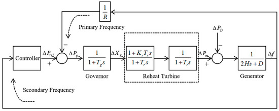 In Figure 3, ΔPref is the system control signal; Tg is the time constant of the governor; ΔXg is the change of valve position; Tr is the reheat time constant; Kr is the ratio of the power generated by steam in the high-pressure cylinder segment to the total power of the turbine; Tt is the turbine time constant; ΔPm is the prime mover output mechanical power deviation; R is the adjustment coefficient; h is the system frequency deviation.