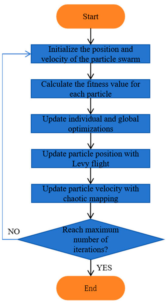 The flow chart of the particle swarm optimization algorithm based on Levy’s flight and Tent chaos mapping involves combining the long-step search characteristics of Levy’s flight with the ability to quickly traverse the initial solution space of Tent chaos mapping to enhance the global search of the PSO algorithm. The IPSO algorithm flow chart is shown in Figure 6.
