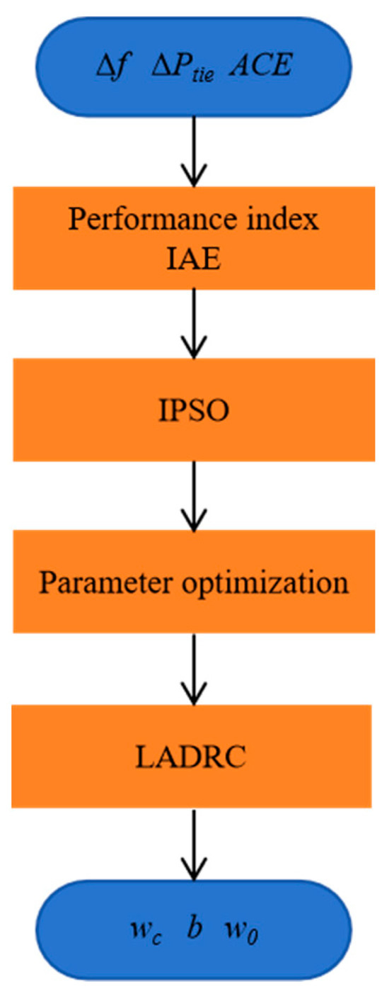 It can be seen more intuitively from the table that there is a certain gap between the improved PSO-optimized LADRC and the PSO-optimized LADRC. Taking the IAE of ACE1 as an example, it can be seen that the IAE value of the standard PSO-optimized LADRC is more than 3 times greater than that of the improved PSO-optimized LADRC, thus confirming that the improved PSO-optimized LADRC has higher response speed and tracking accuracy. In view of this, in order to ultimately obtain better dynamic performance of the control system, this article will select appropriate parameters to optimize the objective function according to the IPSO algorithm in the LADRC control system, thereby obtaining appropriate LADRC parameters. The basic process is shown in Figure 8.
