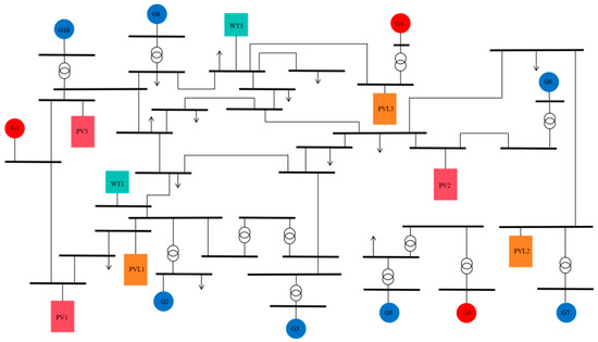 A three-area interconnected power system model containing renewable energy was constructed by MATLAB/Simulink to verify the frequency modulation performance of the proposed method under the action of load disturbance. Figure 9 shows the model diagram of the three-region interconnected power system. Based on the classic IEEE-39 node system, this model artificially divides the system into three control areas, and adds PVG and WTG to some nodes of the system.
