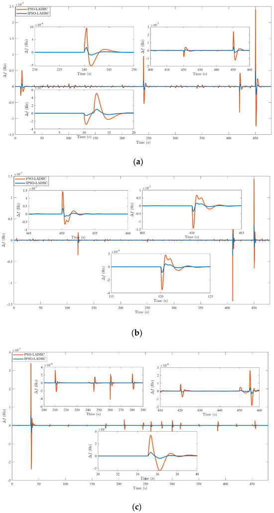 It can be clearly seen from Figure 11 that the controller optimized by the algorithm obviously performs much better in dynamic performance indicators than the controller without algorithm optimization, and its frequency deviation is not even an order of magnitude; in addition, when the system has large load disturbances, it can be found that the controller optimized by the IPSO algorithm can better track the changes in load disturbance and have a smaller frequency deviation than the controller optimized by the PSO algorithm.