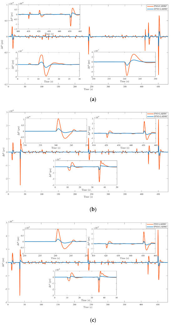 Specifically, it can be clearly seen from the partial enlargement of Figure 12a that the maximum inter-regional tie line exchange power deviation of the system controlled by the LADRC controller optimized by the PSO algorithm is −1.23 × 10−6, and the maximum frequency deviation of the system controlled by the LADRC controller optimized by the IPSO algorithm is only −0.32 × 10−6, a year-on-year decrease of 73.98%; in the maximum frequency deviation of the system controlled by the LADRC controller optimized by the PSO algorithm between area 2–3, the deviation is 2.37 × 10−6, while the maximum frequency deviation of the system controlled by the LADRC controller optimized by the IPSO algorithm is 0.42 × 10−7, a year-on-year decrease of 82.28%; similarly, between area 3–1 optimized by the PSO algorithm, the maximum frequency deviation of the system controlled by the LADRC controller is 4.0 × 10−6, while the maximum frequency deviation of the system controlled by the LADRC controller optimized by the IPSO algorithm is 0.61 × 10−6, a year-on-year decrease of 84.75%. It should be known that the controller optimized by the IPSO algorithm can significantly reduce the exchange power deviation of the tie line, which also proves its excellent control effect.