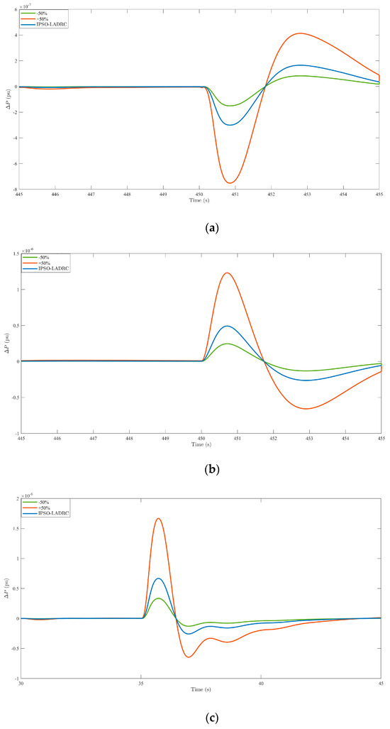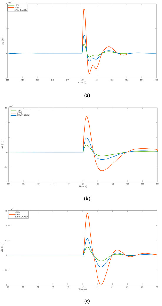 Frequency deviation of each area when the system parameter is nominal value, +50% nominal value, and −50% nominal value. (a) Area 1 frequency deviation; (b) Area 2 frequency deviation; (c) Area 3 frequency deviation.