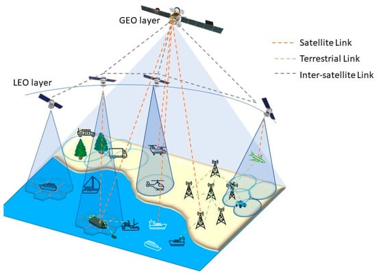 Future SatCom system topologies should benefit a range of diverse space elements, integrating together GEO, LEO, or medium Earth orbit (MEO) satellites [3]. This leads to the multi-layered SatCom system (MLSS) architecture studied previously, e.g., between LEO and MEO systems in [4,5]. The MLSS definition we adopt is that of a satellite communication network that aggregates multiple satellite layers, where different layers refer to different orbiting altitudes of satellite constellations and that has been thoroughly designed to operate as a multi-layer system, rather than a loose aggregation of different layers. Consequently, we make an assumption that an MLSS is expected to have at least two satellite orbital layers in addition to potentially any other terrestrial layers.