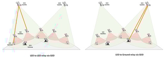 LEO to ground and LEO to LEO traffic backhaul via GSO. The cones represent the coverage areas of satellites where darker colors are used for LEO connections. The orange links visualize the actual connections in each figure.