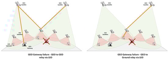 GEO to GEO and GEO to Ground relay via LEO. The cones represent the coverage areas of satellites where darker colors are used for LEO connections. The orange links visualize the actual connections in each figure. Gateway failure is marked with red X.