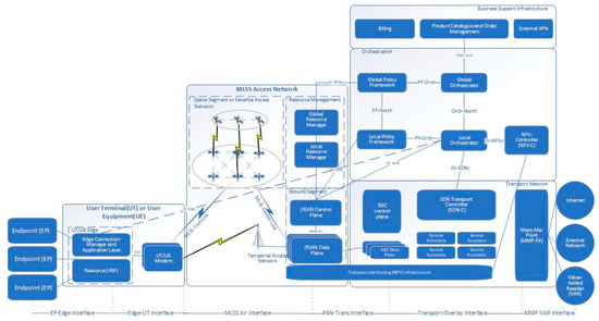 The proposed high-level architecture of the MLSS is depicted in Figure 4. The space segment has been abstracted in this high-level architecture. The proposed HLA assumes that all constituting Access, Core, and Transport networks are virtualized (vRANs) and programmatically controlled (SDNs). The orchestration and resource management used in various networks have a hierarchical distributed architecture.