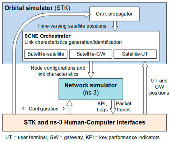 To study the defined system, we implemented a simplified version of it with our simulation software, called SCNE [46]. The modeled MLSS system was defined with the parameters presented in Table 2. As depicted in Figure 5, SCNE consists of a Systems Tool Kit (STK) and ns-3 simulators, and an orchestrator between these elements. STK is used for modeling the satellite constellation part, i.e., satellite, gateway, and user terminal locations, and the visibility and link budgets between all nodes. This information is then used in the ns-3 network simulator to create a similar scenario with the physical layer (L1) based on the link characteristics computed in the STK. The upper layers (from L2 to applications) are modeled solely inside ns-3. The role of the orchestrator is to collect and compute all the necessary information from the STK scenario into configuration files that are then read by the ns-3.