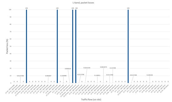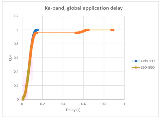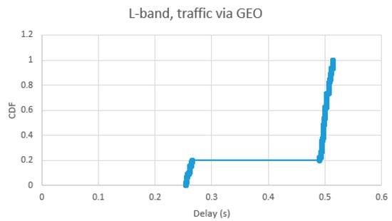 Results for the simulations are shown in Figure 6, Figure 7, Figure 8 and Figure 9. Figure 6 and Figure 7 present the cumulative distribution function (CDF) of the end-to-end delay and packet loss percentage when the packets were routed only via the GEO layer. In our scenario, about 20% of the packets went only via one GEO satellite, i.e., the source UT and destination GW were located under the same GEO satellite. The end-to-end delay was then around 265 ms. The rest of the packets used a GEO-GEO ISL to reach the other satellite that served the destination GW. The delay was then around 515 ms. In individual UT-GW traffic flows, the jitter (as standard deviation from the mean end-to-end delay of the flow) was between 0.02–0.04 ms.