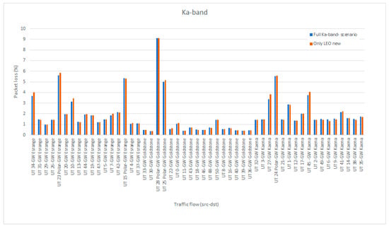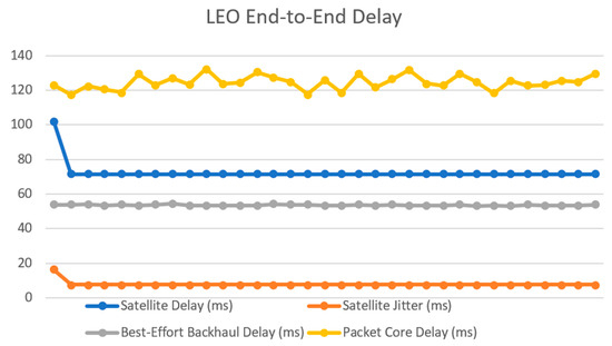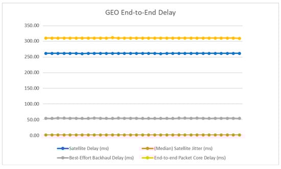 The target of the simulation studies was to see whether there are benefits to the use of the MLSS system vs. a single-layer system. Our hypothesis was that the MLSS can support both delay and jitter (as standard deviation from the mean delay) sensitive traffic depending on via which satellite layer the packets are routed, while a single-layer system can support only one of those elements, depending on the orbit. The key performance indicators (KPIs) selected for the performance assessment were end-to-end delay, jitter, packet loss, and throughput. The simulation results (end-to-end delay) also served as inputs to the testbed activities that are described in Section 5.2. The end-to-end delay is defined as the total delay from the UT via the satellite(s) to the GW.
