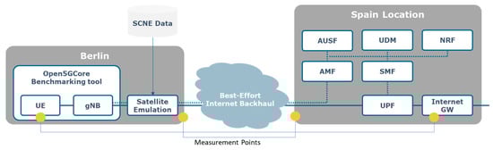 - Kumar, S.; Abdalla, A.; Kodheli, O.; Querol, J.; Chatzinotas, S.; Schlichter, T.; Casati, G.; Heyn, T.; Volk, F.; Kaya, S.; et al. 5G-NTN GEO-based in-lab demonstrator using OpenAirInterface5G. In Proceedings of the 11th Advanced Satellite Multimedia Conference, Graz, Austria, 6–8 September 2022. [Google Scholar]