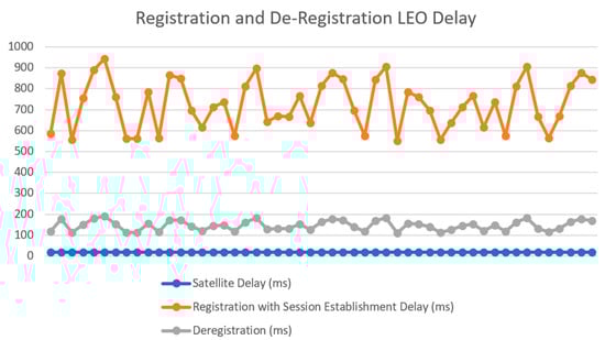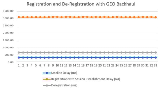 As immediately noticeable from the measurements, the procedures are directly proportionate to the end-to-end delay between the two locations. Specifically, for the Registration with Session Establishment, the delay of the procedure is ten times bigger than the delay of the backhaul, as there are five message exchanges with the UE as part of the registration procedure (Registration Request—Authentication Request, Authentication Response—Security Mode Command, Uplink Network Access Server (NAS) Transport—Initial Context Setup Response, Uplink NAS Transport—Downlink NAS Transport, Uplink NAS Transport—Protocol Data Unit (PDU) Session Resource Setup) while for the Deregistration it is two times bigger than the backhaul delay, as there is a single message exchange (Deregistration request—Deregistration accept). The results for the GEO backhaul confirm previous measurements using real satellite connectivity.