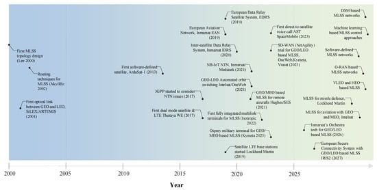 MLSS technology roadmap summary. Lastly, we present a concise summary of a roadmap of the MLSS technology by presenting a collection of some key past and expected milestones. In particular, we include some important past integration development steps of different satellite layers including conventional terrestrial/satellite layer integration development, subsequent MLSS testbeds, and anticipated MLSS system features in the future, for which more information for specific technologies is provided, e.g., in [24,49,50,51]. The roadmap illustrating the development trends of MLSS is depicted in Figure 15. Some main observations of the roadmap include the following: