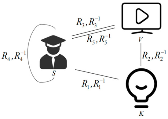 A heterogeneous information network [20] is defined as a directed graph with object type mappings and relation type mappings , where the sum of the total number of object types and the total number of relationship types is greater than 2. Figure 1 illustrates a heterogeneous information network constructed for a particular course based on an MOOC platform, consisting of three object types: students , videos , and knowledge concepts , and 10 relationships between them, where denotes the correspondence between different types of objects ( denotes the inverse of ), , , , , and denote learn (learnt by), include (included in), watch (watched by), reply (replied by), and comment (commented by), respectively.