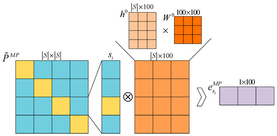 As shown in the first part of Figure 4, the representation learning of students and knowledge concepts under the meta-path can be synchronised. The steps are as follows: Firstly, in the constructed heterogeneous information network , according to the selected set of meta-paths , the set of adjacency matrices under the meta-paths can be calculated by Formula (1). In the figure, the upper four are the student adjacency matrices , and the lower two are the knowledge concepts adjacency matrices . Secondly, the features of the initialised student and knowledge concepts are combined with the adjacency matrix obtained from the different meta-paths and are input into a single-layer GCN, and the representations of the student and knowledge concepts under are learnt according to Equation (2). Finally, the learnt knowledge concept representation and student representation under different meta-paths are saved in the form of sequences, and the weights of different knowledge concept meta-paths are learnt by using the attention mechanism and weighted and merged to obtain the final knowledge concept representation Z. Meanwhile, the list of student representations is retained in order to prepare for the subsequent generation of the final student representations.