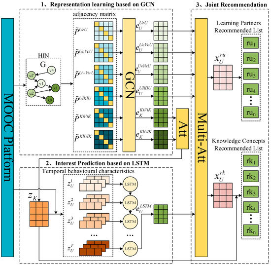 Based on the MOOC platform, the representation learning module constructs HINs containing three kinds of objects and their correspondences, namely, students, videos, and knowledge concepts, and selects student and knowledge concept meta-paths to generate the corresponding adjacency matrices , and learns the student representations and knowledge concept representations under different meta-paths through the GCN model, so as to be prepared for the subsequent fusion of student and knowledge concept representations by using the attention mechanism. The knowledge concept representation is used as input to the attention network to obtain the final knowledge concept feature . The Learning Interest Prediction Module obtains the student’s temporal behavioural features based on the student’s temporal learning behaviours and knowledge conceptual features, and captures the dependencies in the student’s temporal behavioural data through LSTM to predict the student’s current learning interest . Based on the MMoE framework, multiple attention networks are used in the joint recommendation module to fuse the students’ representations under different meta-paths as well as the students’ interest features in order to learn the students’ representations and that satisfy the two tasks of knowledge concept recommendation and learning partner recommendation, respectively, and to generate a list of the students’ personalised knowledge concepts and learning partner recommendations.