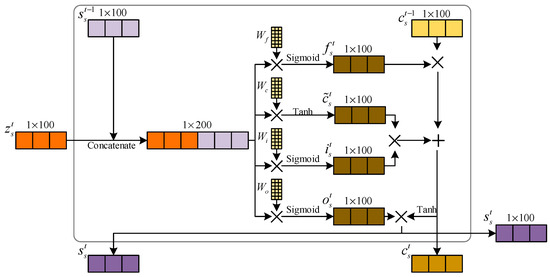 where and are trainable parameters and denotes the serial operation. After passing through the three gates, the memory cell vector H and the state vector I are computed as shown in Equation (6):