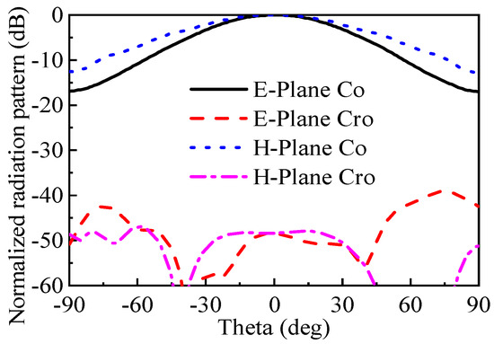 The normalized radiation pattern of the horn antenna element. Co and Cro indicate that the polarization was the same as the antenna’s polarization (coplanar) or perpendicular to the antenna’s polarization (cross).