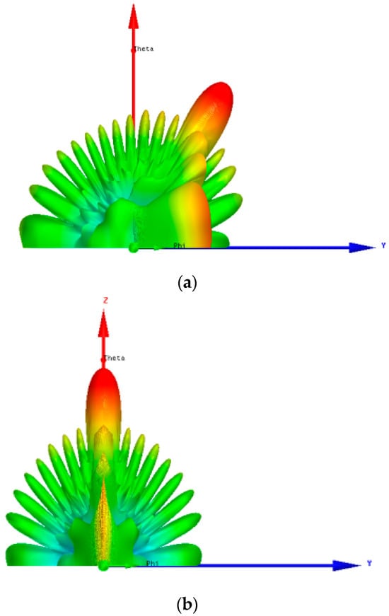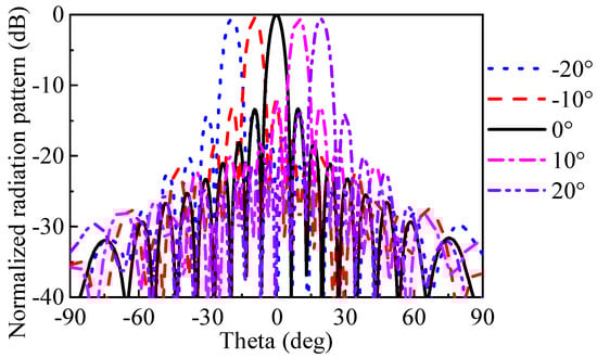 Figure 3 shows the simulated radiation pattern of the horn element, while the simulated 3D radiation patterns at different scanning angles of the antenna array are shown in Figure 4. As shown in the figure, the horn antenna had a wide beam and a low level of cross-polarization. The antenna was able to scan at the desired angle. Figure 5 shows the simulated 2D E-plane radiation pattern of the antenna at different scanning angles at 14.5 GHz. In the figure, one can see that the antenna was able to maintain a low sidelobe when scanning at 20°. It is noted that in the simulation, the feeding amplitude was set as constant.
