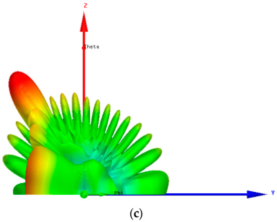 Simulated 3D radiation patterns of the phased array at different beam-scanning angles. The red means the maximum value and the blue means the minimum value. (a) Scanning angle: 30°. (b) Scanning angle: 0°. (c) Scanning angle: −30°.