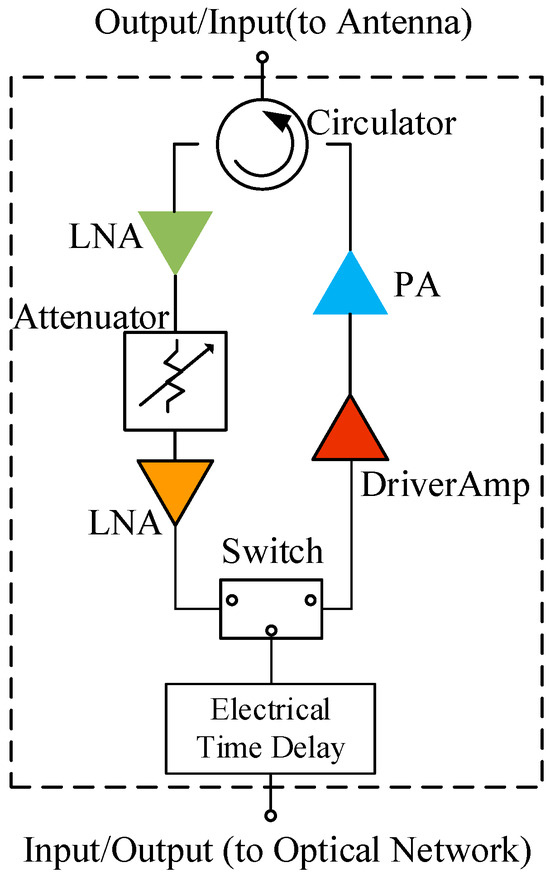 Figure 6 shows a schematic diagram of a single TR channel. Specifically, the TR channel contained a circulator, a switch, an electrical time-delay module, an amplifier, and an attenuator for the control of the power amplifier’s amplitude. The amplifier for the receiving link contained two low-noise amplifiers (LNAs) for the amplification of small signals, while the amplifier for the transmitting link contained a power amplifier (PA) and a pre-amplifier for the PA. It is noted that an LNA is a kind of power amplifier with quite low-noise features. A drive amplifier was used to amplify a microwave signal at the primary level, after which the signal entered a power amplifier for the high-power signal output. The use of a circulator and switch ensured that the receiving and transmitting links could work simultaneously.