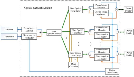 Unlike conventional phased arrays, microwave-photonics-based phased arrays use optical techniques to achieve the phase shift or time delay required for beam scanning. In their design, an optoelectronic conversion device is used to convert microwave signals into optical-band signals and delay the signals in the optical band to achieve different phase-shift values [33,34,35]. It is possible to use optical signals propagating through optical fibers of different lengths to achieve different actual delays and then demodulate the microwave signal from the optical signal. Such fibers have stable transmission characteristics because the optical carrier frequency is high and the signal bandwidth is small relative to the optical carrier frequency. The optical signal is delayed and then converted back into a microwave signal by an optoelectronic converter to achieve the true time delay over a wide bandwidth range. This makes large instantaneous operating bandwidths possible. In addition, compared to microwave transmission lines, optical fibers have very low loss, and optical signals can propagate within fibers with very high efficiency, thus reducing signal loss and enabling the long-distance transmission of signals. At the same time, an optical signal is bound to propagate within an optical fiber, and the interference between the optical signals of different channels is low, which is conducive to the improvement of the performance of the system.