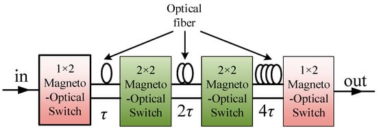 To achieve the maximum delay and delay step requirements, the designed beamforming network needed to have a six-bit phase-shifting accuracy, and in order to achieve higher phase-shifting accuracy and lower system complexity, we chose a composite optical beamforming network, which consisted of a three-bit optical switch array and a six-bit electrical delay line to form a series-connected time-delay network. The optical delay line is shown in Figure 8. It consisted of two 2 × 2 magneto-optical switches and two 1 × 2 magneto-optical switches; the light was input into the 1 × 2 magneto-optical switches, passed through two 2 × 2 magneto-optical switches in sequence, and, finally, passed through the output of the 1 × 2 magneto-optical switches. The lengths of the two optical fibers that were output from each level of the magneto-optical switches differed by a factor of 2n.