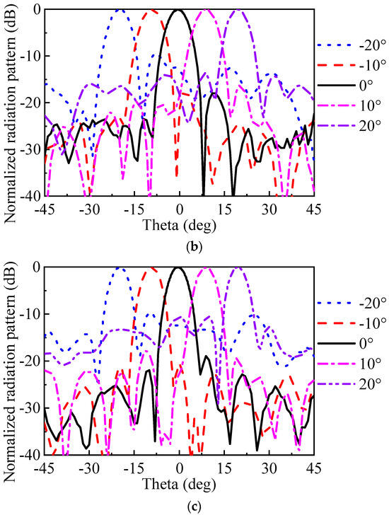 Measured antenna radiation patterns of the phased array (a) at 12 GHz, (b) 14.5 GHz, and (c) 17 GHz.