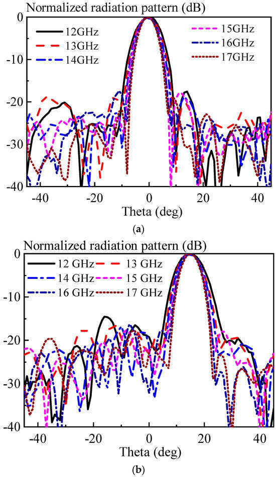 When conducting measurements, to realize the low-sidelobe requirement for the array antenna, the Taylor amplitude weighting was used to design the feed amplitude. Figure 10 shows the measured radiation patterns of the presented antenna system when the array scanned at different angles along the E-plane at 12 GHz, 14.5 GHz, and 17 GHz. As can be seen in the figures, when the antenna array scanned at an angle of 0°, its sidelobe level was higher than 18 dB at all of the frequencies. When the antenna array reached a scanning angle of 30°, the sidelobe level was higher than 18 dB at 12 GHz and 12 dB at 14.5 and 17 GHz. From the results, one can see that over a wide operating bandwidth, the beam-scanning angle of the antenna was kept almost constant.