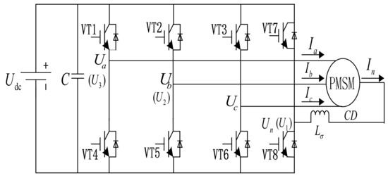 In Figure 3, and form the A bridge arm; and form the B bridge arm; and form the C bridge arm; and form the fourth bridge arm. is the DC voltage source; is the additional inductance. , , and are the output voltages; , , and are currents of the inverter; and represent the voltage and current of the fourth bridge arm of the inverter.