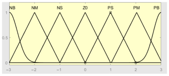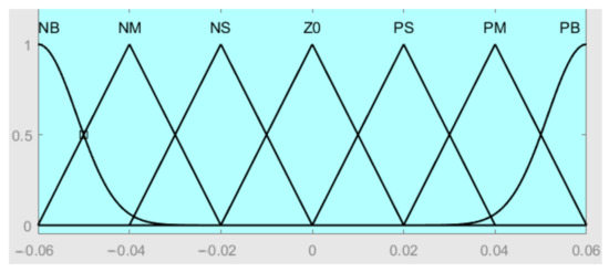 In the above figure, and are the input quantity of fuzzy control, ; and are the exact output after unfuzzing; and the fuzzy subset is set as {“negative large (NB)”, “negative medium (NM)”, “negative small (NS)”, “zero (ZO)”, “positive small (PS)”, “middle (PM)”, “positive large (PB)”}.