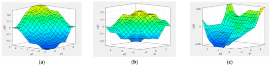 The surface diagrams of , , and obtained according to fuzzy rules are shown in Figure 9.