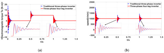 When the load of a PMSM changes abruptly, the current and torque of the motor fluctuate violently under the influence of sudden load. The three-phase four-bridge inverter has the function of a filter, which can filter out the current harmonics induced by using the unexpected change of the motor load, thus reducing the torque and current ripple of the motor and avoiding the problem of motor efficiency reduction caused by current harmonics caused by complex sudden change.