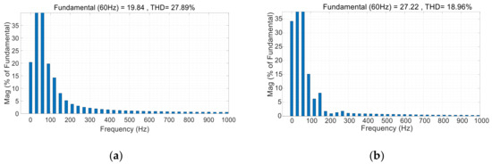 Inverter harmonic comparison diagram. (a) Traditional three-phase inverter current harmonic diagram; (b) three-phase four-bridge inverter current harmonic diagram.