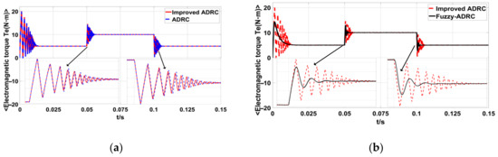Motor torque comparison diagram. (a) ADRC and improved ADRC torque diagram; (b) improved ADRC and fuzzy-ADRC torque diagram.