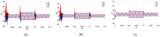 Motor current comparison diagram. (a) Motor current diagram under ADRC; (b) motor current diagram under improved ADRC; (c) motor current diagram under fuzzy-ADRC.