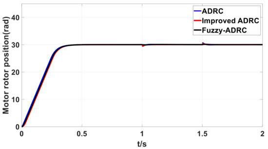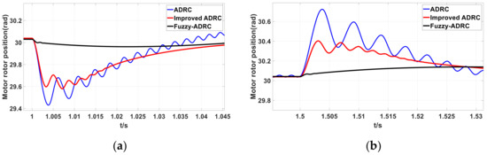 Via a comparative analysis of Figure 16 and Figure 17, it can be seen that when the given rotor position is 30 rad, under ADRC, improved ADRC, and fuzzy-ADRC, the rotor position fluctuation of the motor under ADRC is largest when the motor load changes abruptly. The position fluctuation of the motor rotor under the improved ADRC is less than that under ADRC, and the time to return to the predetermined position is shorter. The position of the motor rotor under fuzzy-ADRC comprises basically no pulsation, and its stability is the best.