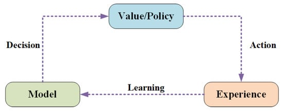 Model-based reinforcement learning (MBRL) is a method of learning a model (environment model) by first obtaining data from the environment and then optimizing the policy based on the learned model [93]. The model is a simulation of the real world. In MBRL, one of the most central steps is the construction of an environment model, and the complete learning steps are summarized in Figure 2. First, a model is built from the experience of interacting with the real world. Second, the model is learned and updated with value functions and strategies, drawing on the methods used in MDP, TD, and other previous approaches. Subsequently, the learned value functions and strategies are used to interact with the real world, i.e., a course of action is planned in advance, and then the agent follows the course of action and explores the real environment to gain more experience (updating the value functions and strategies through the error values returned to update and make the environment model more accurate).