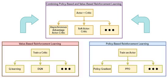 From the optimization direction, reinforcement learning can be classified into three main categories: algorithms based on value optimization [104], algorithms based on policy optimization [105], and algorithms combining value optimization and policy optimization [106]. Typical value-optimization algorithms are Q-learning and SARSA, and typical policy-optimization algorithms are TRPO (trust region policy optimization) and PPO (proximal policy optimization). The current research trend of algorithms combining value optimization and policy optimization is mainly based on the actor–critic (AC) method for improved optimization (the actor models the policy and the critic models the value function). These classifications stem from the classic textbooks in the field of reinforcement learning [107]. They represent two distinct approaches to thinking about and solving problems in reinforcement learning.